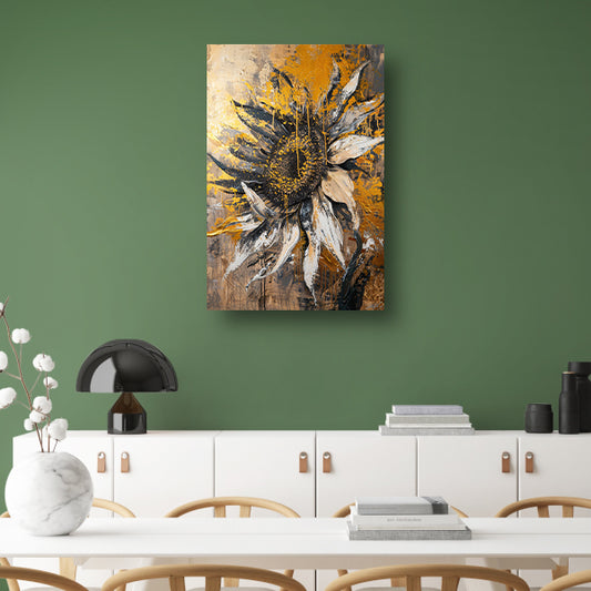 Abstracte zonnebloem in zwart, goud, oranje en wit canvas met baklijst