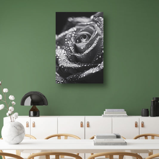 Zwart-witte roos met dauwdruppels close-up canvas met baklijst