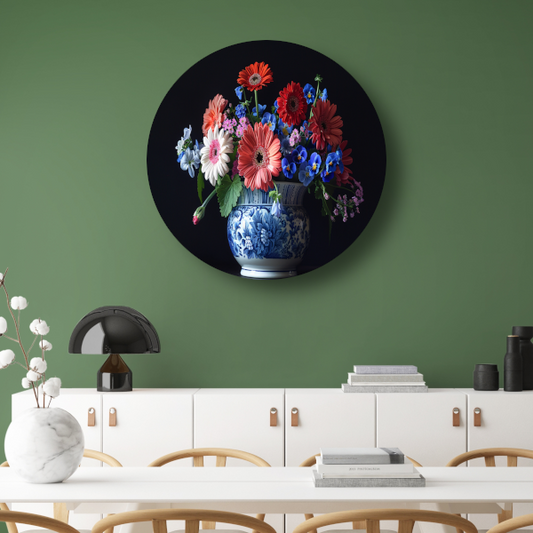 Bloemrijk stilleven in een Delfts blauwe vaas forex muurcirkel