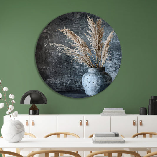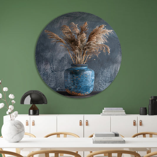 Blauwe vaas met beige pampasgras in minimalistische stijl forex muurcirkel