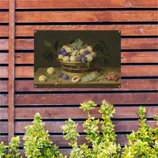 Perziken, pruimen en druiven in een rieten mand, met fruit en een vlinder op een houten tafel - Jacob van Hulsdonck tuinposter