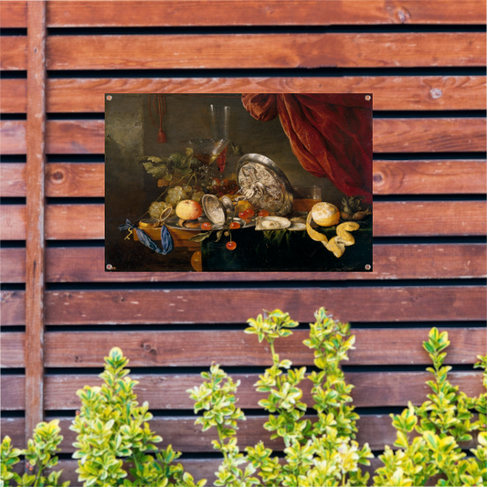 Stilleven met oesters, geroosterde kip, snoep en gedroogd fruit - Jacob van Hulsdonck tuinposter