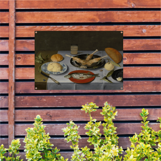 Stilleven van haring, vlees, vruchten, boter en brood - Jacob van Hulsdonck tuinposter