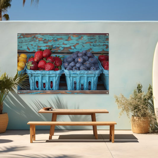 Kleurrijk fruitschaal met aardbeien en blauwe bessen tuinposter