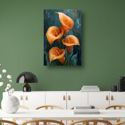 Elegante oranje calla lelies op artistieke achtergrond acrylglas