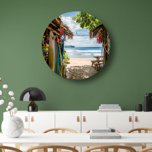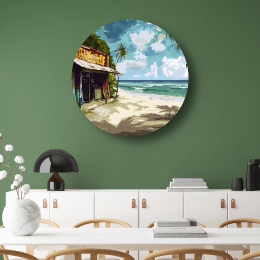 Tropisch Strand met Surfshop en Golven aluminium muurcirkel