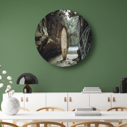 Surfplank met boslandschap aluminium muurcirkel