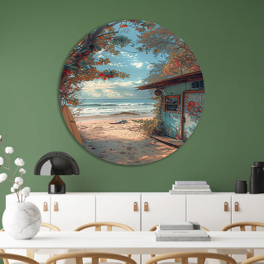 Kleurrijk strandhuisje met surfplanken forex muurcirkel