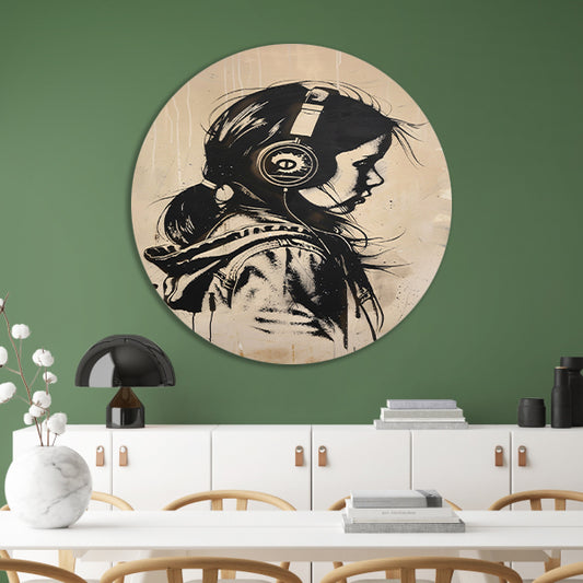 Zwart-wit portret van een meisje met koptelefoon forex muurcirkel