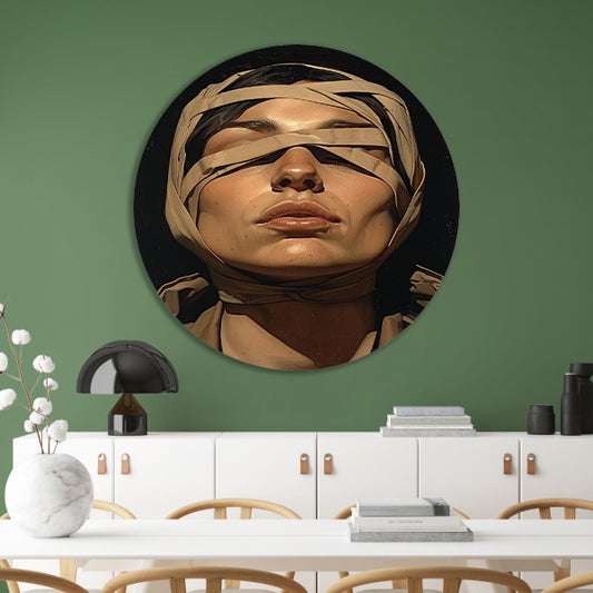 Vrouw met verband over ogen in surrealistische stijl aluminium muurcirkel