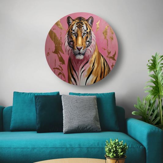 Krachtige Tijger in Goud en Roze aluminium muurcirkel