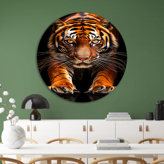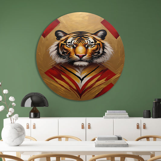 Oranjerood Schilderij van een Majestueuze Tijger aluminium muurcirkel