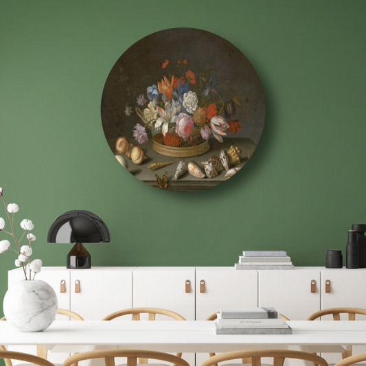 Tulpen, rozen en andere bloemen in een mand - Balthasar van der Ast aluminium muurcirkel
