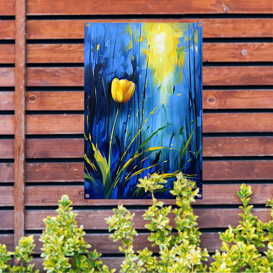 Gele tulp met abstracte blauwe achtergrond tuinposter