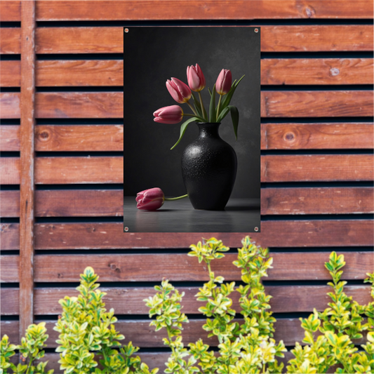 Stilleven met roze tulpen in donkere vaas tuinposter