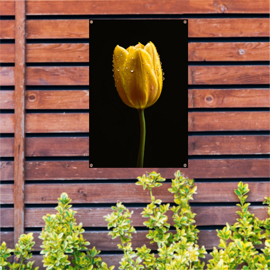 Gele tulp tegen zwarte achtergrond met dauw tuinposter