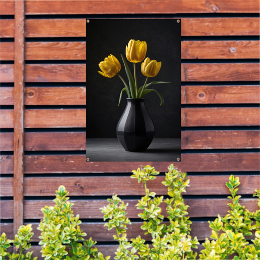 Gele tulpen in een elegante zwarte vaas tuinposter