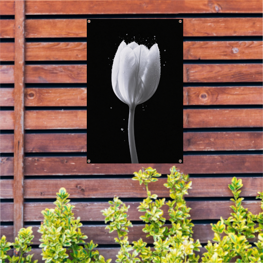 Minimalistische witte tulp met waterdruppels tuinposter