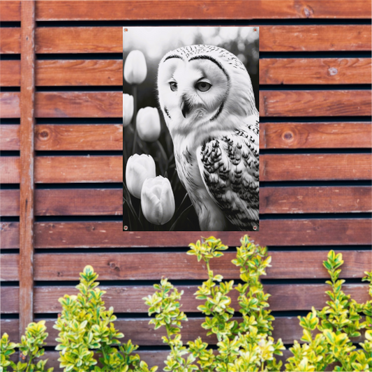 White Owl and Tulips in Monochrome tuinposter
