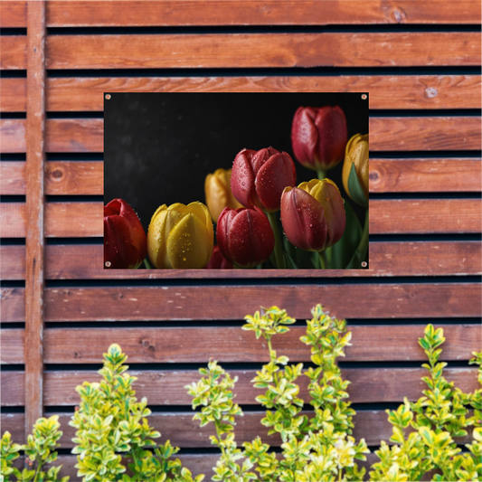 Tulpenpracht met waterdruppels in kleur tuinposter