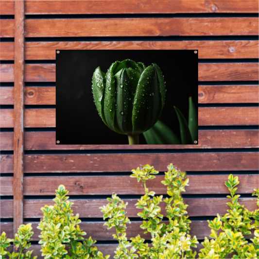 Donkergroene Tulp met Dauw op Zwart tuinposter