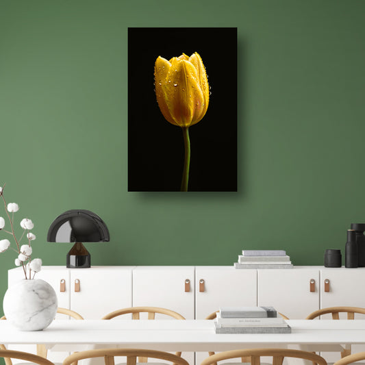 Gele tulp tegen zwarte achtergrond met dauw canvas met baklijst