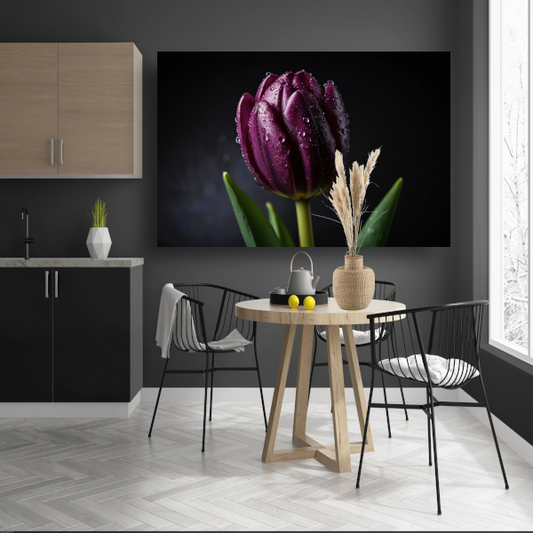 Paarse Tulp in Ochtenddauw Close-up canvas met baklijst