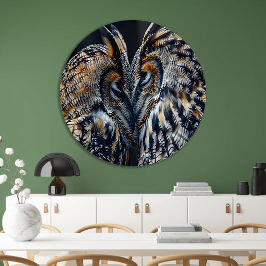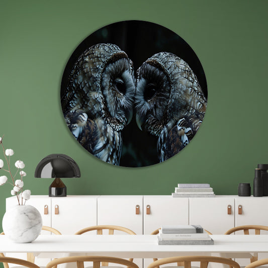 Twee uilen in een donkere omgeving aluminium muurcirkel