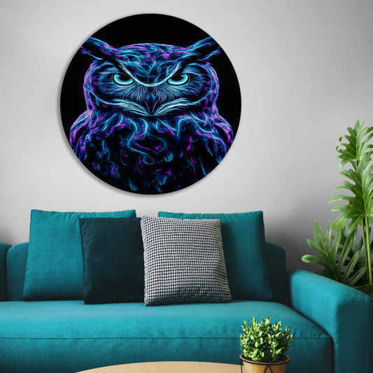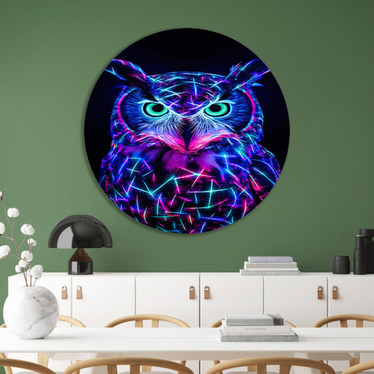 Fluorescerende futuristische uil in levendige kleuren aluminium muurcirkel