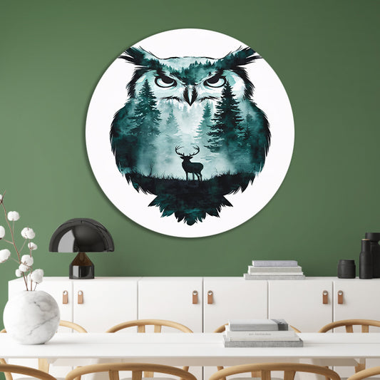 Mystieke uil tegen rustieke achtergrond aluminium muurcirkel