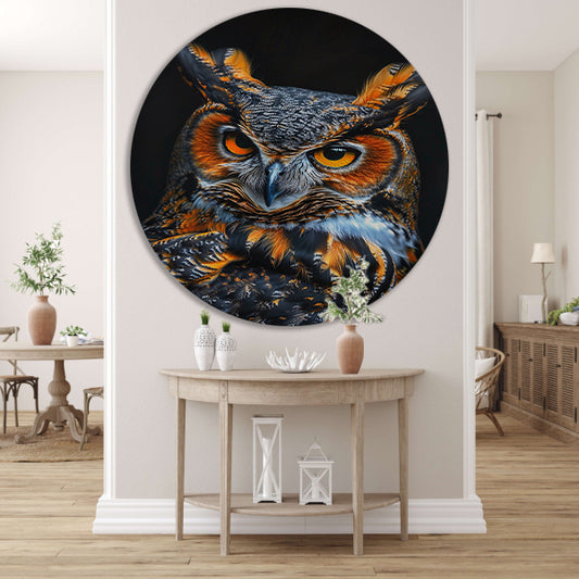 Hyperrealistische Uil met Intense Ogen en Kleurrijke Veren aluminium muurcirkel