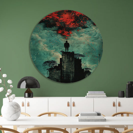 Eenzame Mens in Vervallen Stad met Rode Lucht aluminium muurcirkel