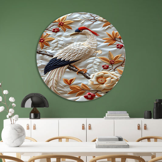 Borduurwerk van een vogel met bloemen aluminium muurcirkel