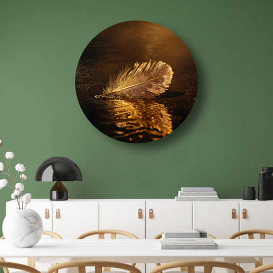 Gouden veer drijvend op mysterieus donker water aluminium muurcirkel