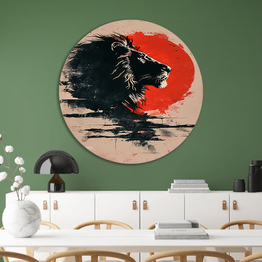 Silhouet van een trotse leeuw bij zonsondergang aluminium muurcirkel