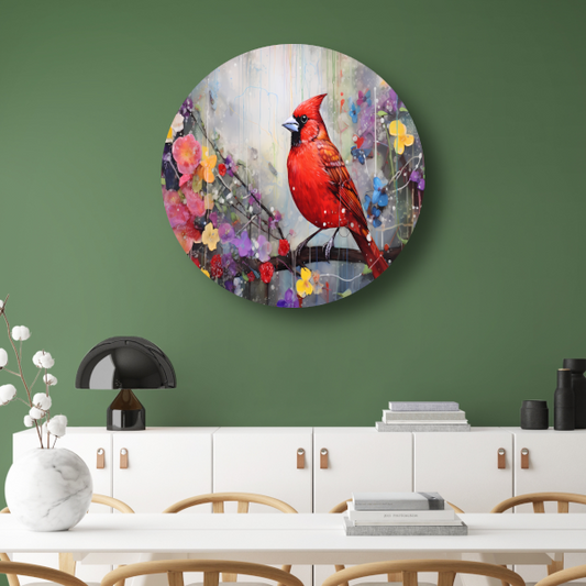 Schilderij: Rode kardinaal, bloemen aluminium muurcirkel