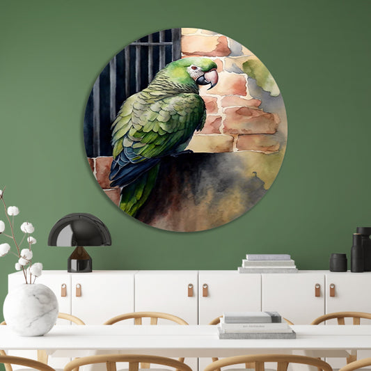 Waakzame Papegaai tegen Rustieke Achtergrond aluminium muurcirkel