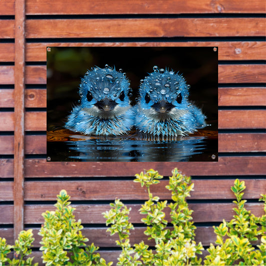 Blauwe Vogels in Ochtenddauw tuinposter