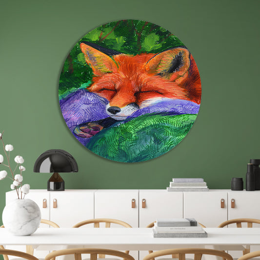 Slapende vos in kleurrijk bos schilderij aluminium muurcirkel