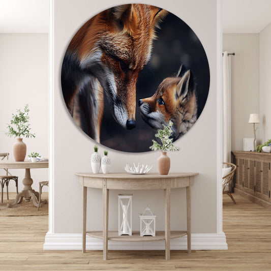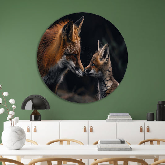 Intiem moment tussen vos en babyvos aluminium muurcirkel