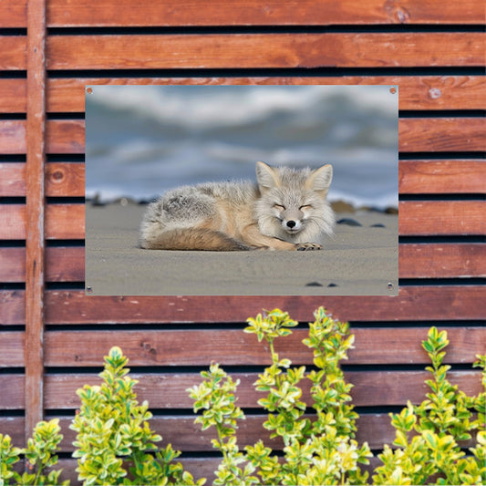 Realistische afbeelding van een vos op het strand tuinposter