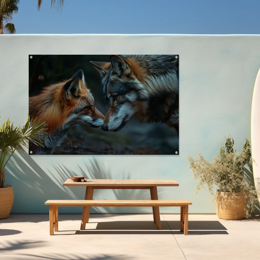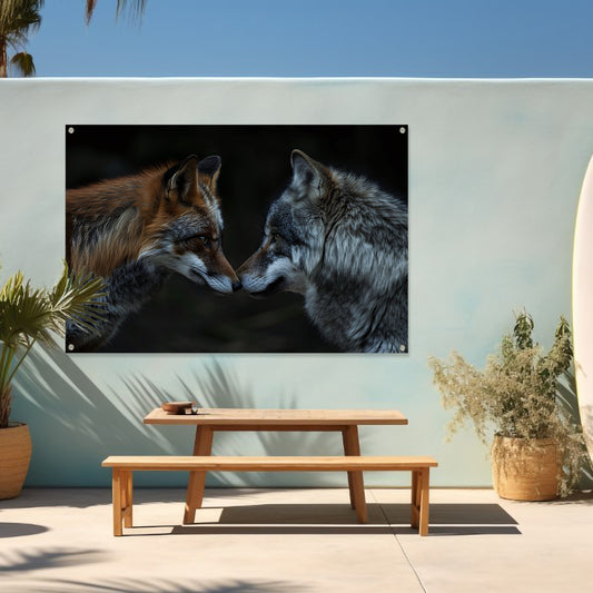 Vos en wolf neus aan neus schilderij tuinposter