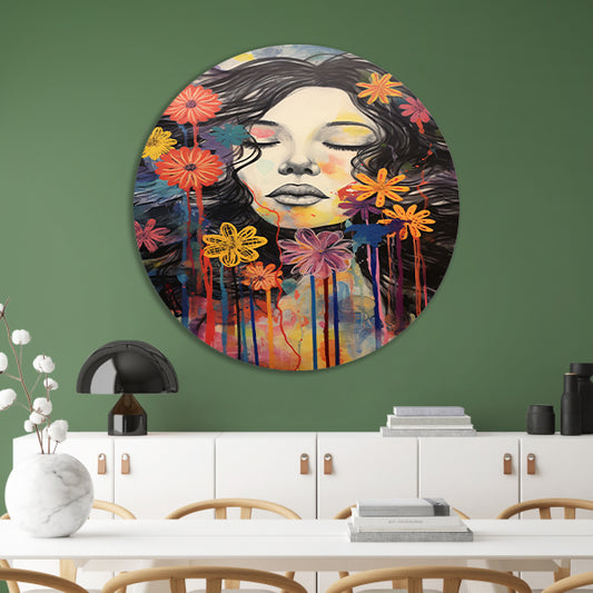 Kleurrijk portret van een vrouw met bloemen en abstracte vormen aluminium muurcirkel