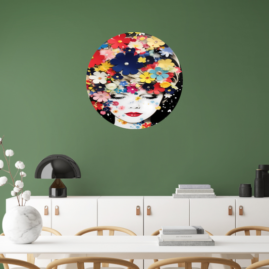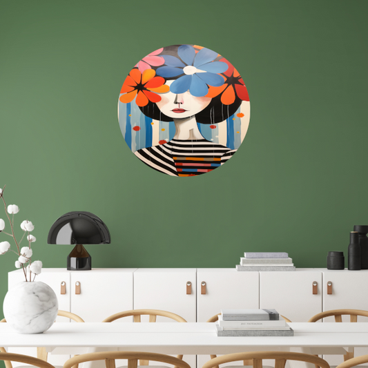 Kleurrijk portret van een vrouw met bloemen en abstracte vormen forex muurcirkel