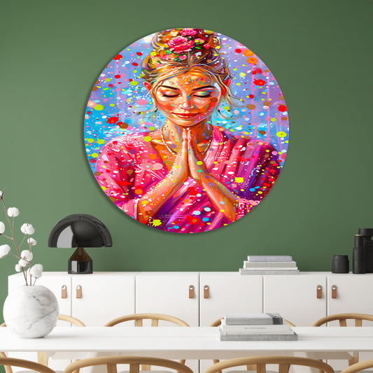 Mediterende vrouw omringd door kleurrijke abstractie aluminium muurcirkel