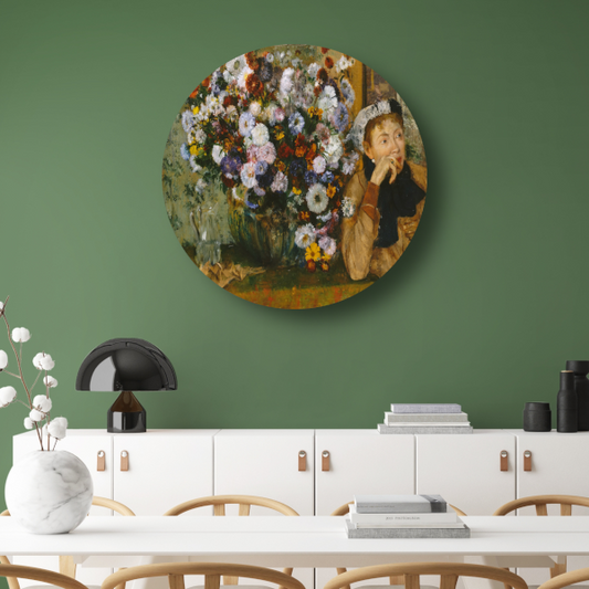 Een vrouw zittend naast een vaas met bloemen - Edgar Degas forex muurcirkel