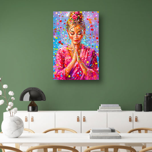 Mediterende vrouw omringd door kleurrijke abstractie canvas met baklijst