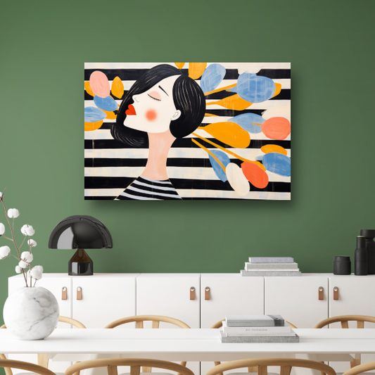 Moderne vrouw omringd door zwevende bloemen canvas met baklijst