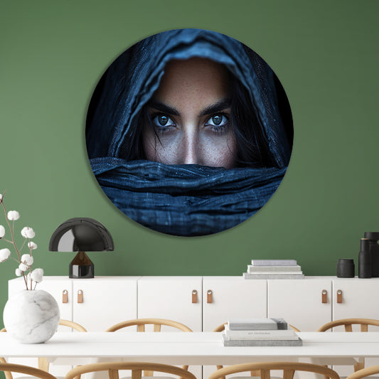 Mysterieuze Vrouw in Textielomhulsel aluminium muurcirkel