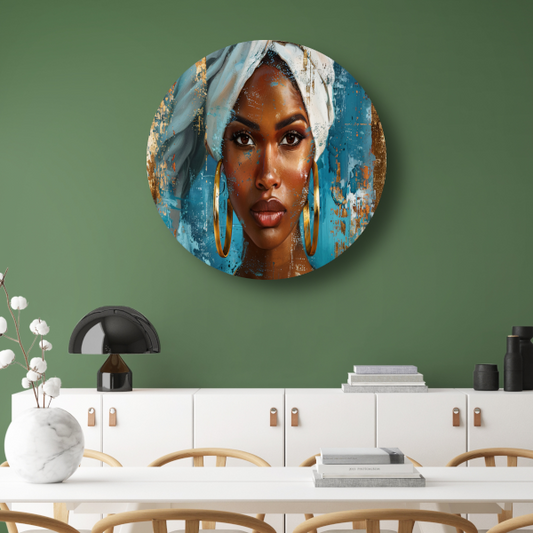 Afrikaanse vrouw met witte hoofddoek en gouden oorbellen aluminium muurcirkel